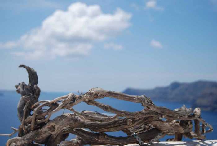 En Santorini las parras no levantan un palmo del suelo. Crecen enrolladas sobre sí mismas, llenando los campos de coronas…